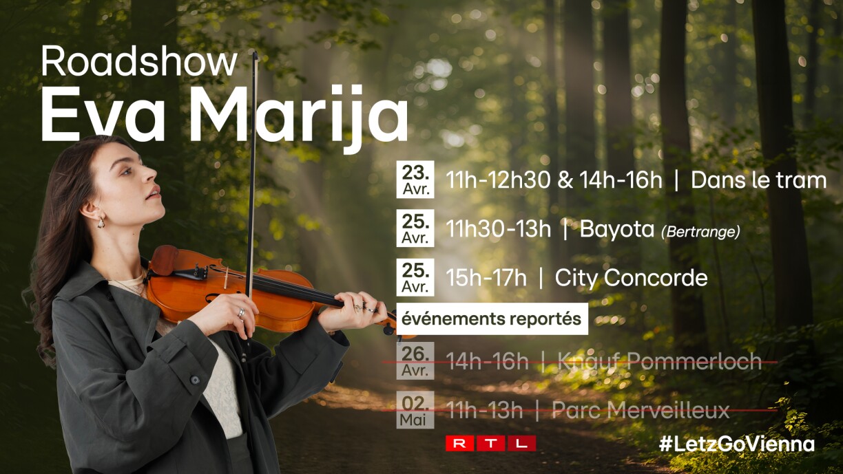 La roadshow débutera le 23 avril à Luxembourg-Ville, où Eva se produira à deux reprises à bord du tram entre Luxexpo et Bonnevoie – une fois le matin et une autre fois dans l’après-midi. Deux jours plus tard, le 25 avril, elle fera étape à Bertrange au Bayota, avant de poursuivre le même jour avec une autre apparition au City Concorde.