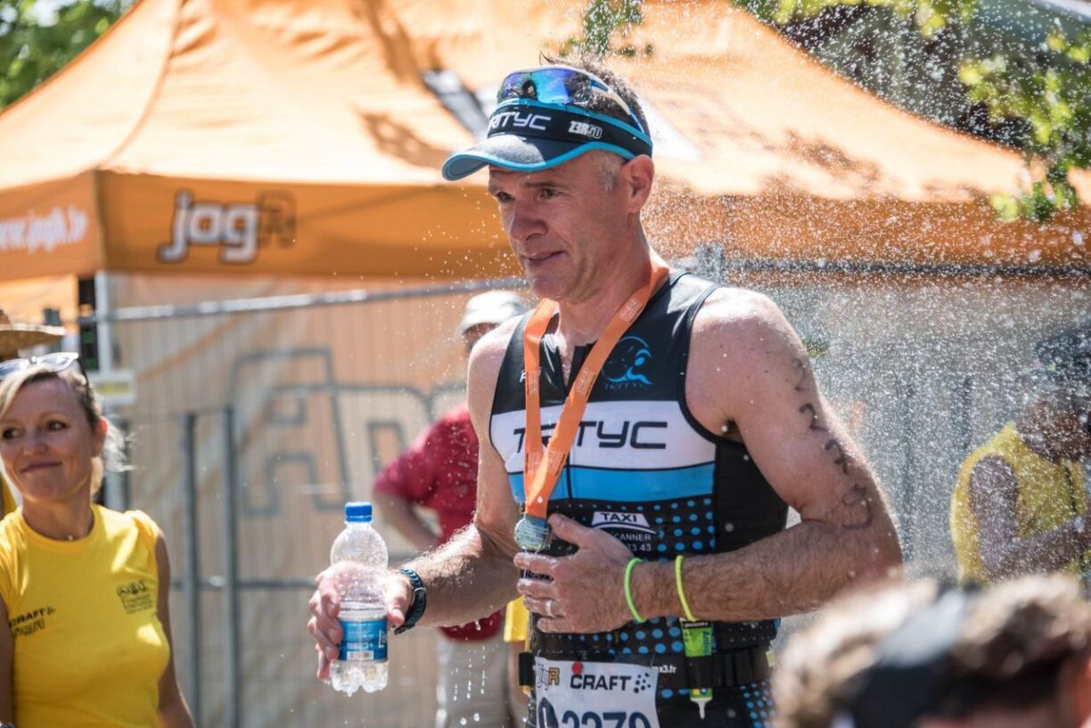 Nous sommes arrivés à Francfort la veille, histoire de s’installer et se préparer. La nuit, Jean-Philippe a été victime d’un incident idiot, il s’est tordu la cheville sur le tapis de la SDB de l’hôtel dans lequel nous logions. Sa cheville a craqué et il s’est fait une vilaine entorse. Sa préparation ayant duré 5 mois, il ne se voyait pas abandonner pour cela. Beaucoup l’aurait fait et cela aurait été normal. Lui non… sa cheville a gonflé et est devenue toute bleue et à 4h du matin, il se levait tout de même pour aller rejoindre le départ. La natation fut difficile, le vélo pas du tout et le marathon fut un réel calvaire. Malgré tout, la chaleur, les douleurs dans tout le corps ne l’ont pas empêché de terminer son Iroman en 12h57 alors qu’il souhaitait le finir en 11h environ.