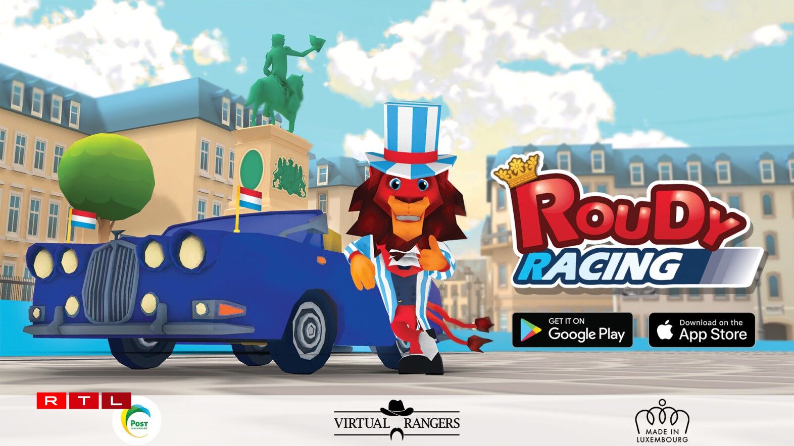 Dans “Roudy Racing”, pas de Mario Bros installé dans les bolides, évidemment, mais le lion rouge (le fameux roude Léiw, emblème des armoiries de Luxembourg). Celui-ci déboule à travers des lieux emblématiques de la ville, comme le palais Grand-Ducal, la Gëlle Fra, l’Hôtel des Postes ou la Cathédrale Notre-Dame. Au rayon des véhicules, notre fauve passe d’une voiture de police à une ambulance, en se mettant derrière le volant de plusieurs voitures de collection, d’une camion de pompier, d’un tracteur et même d’une locomotive.