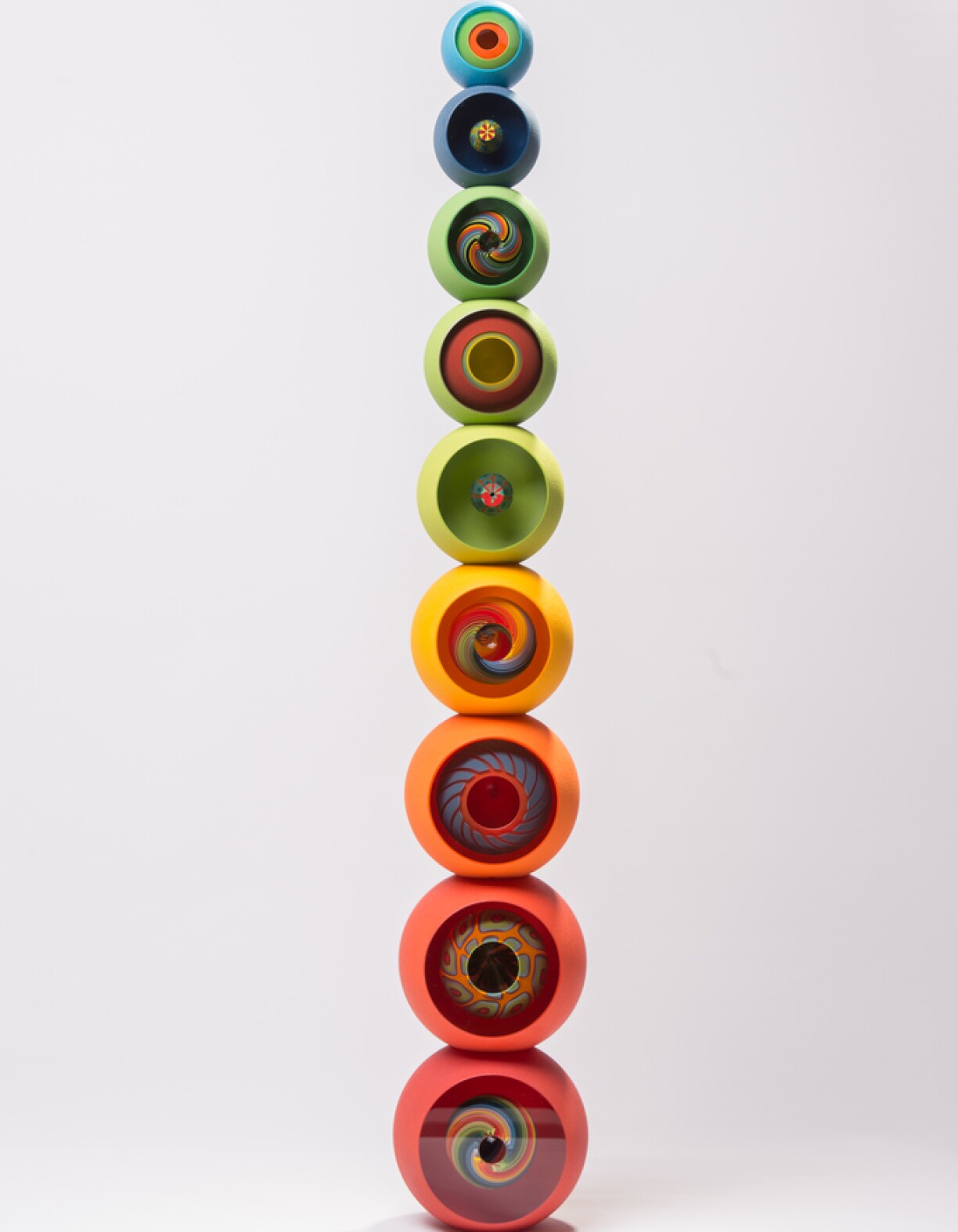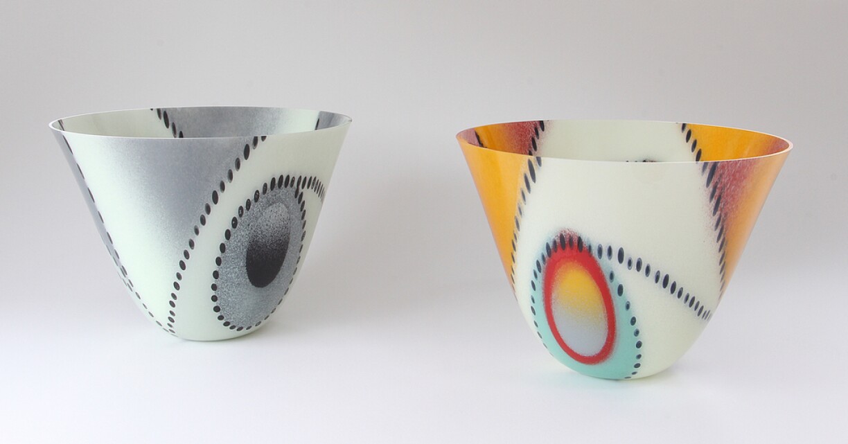 Les objets en verre se composent de multiples couches de verre. Les aplats de couleurs sont appliqués avec une bruine et cuite. Ensuite il y a la fusion de celle - ci pour obtenir une masse homogène. Ce verre en fusion est modelé par thermoformage, coupé et poli. La nature, l’histoire de l’art, la photographie sont des sources d’inspirations.