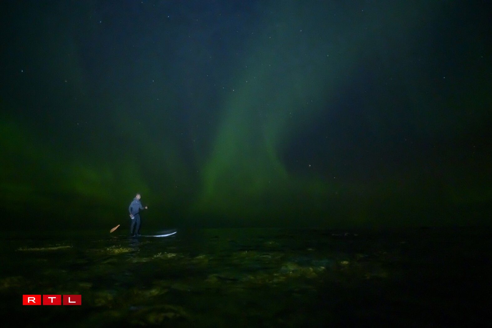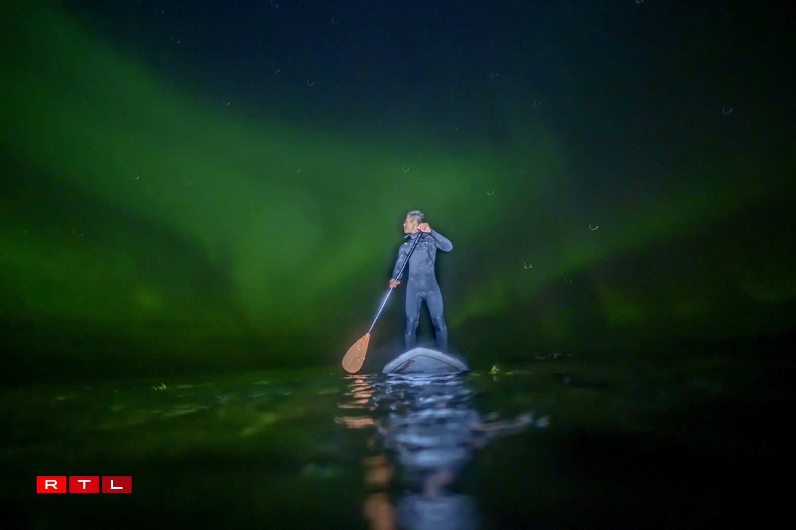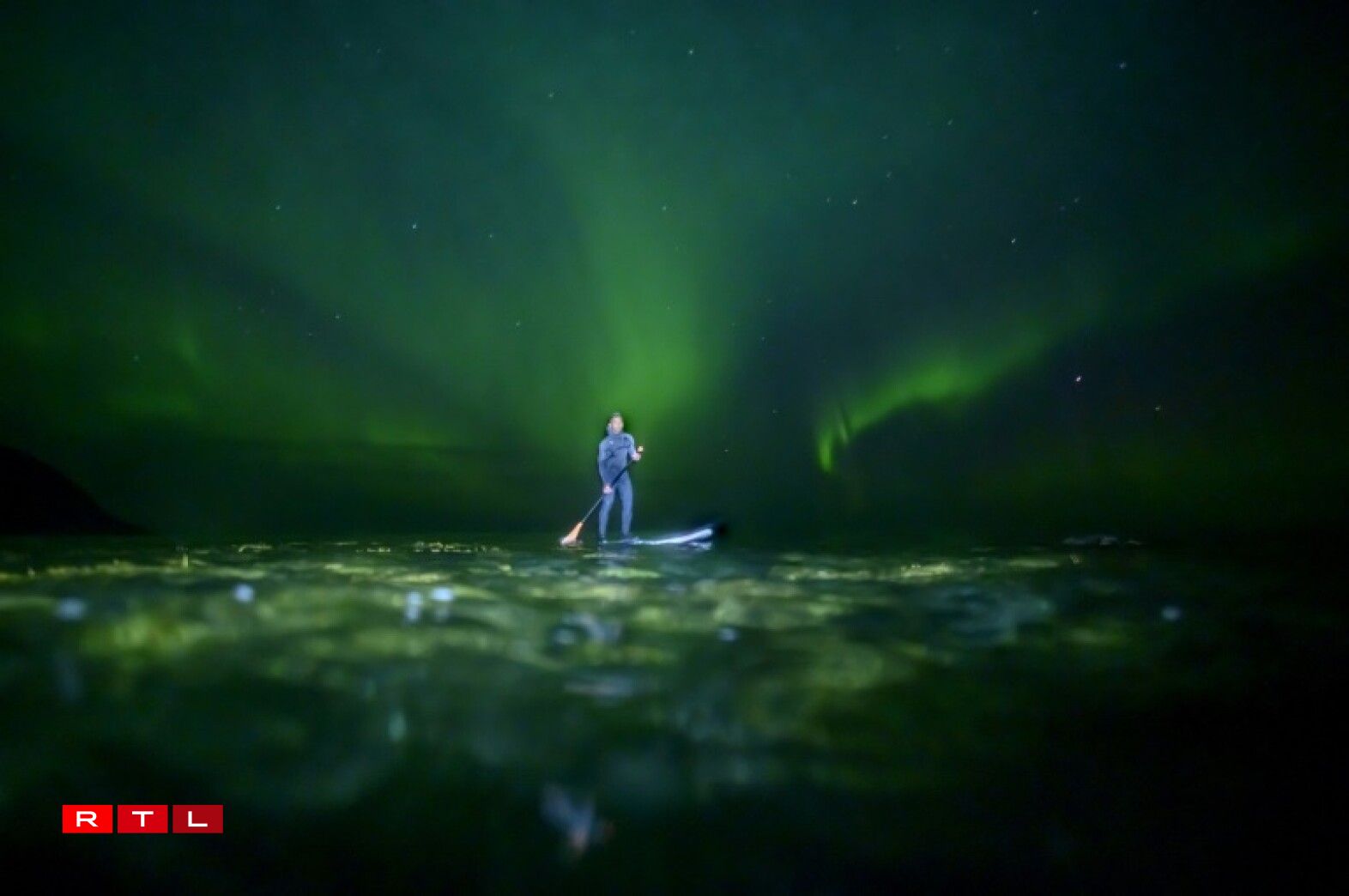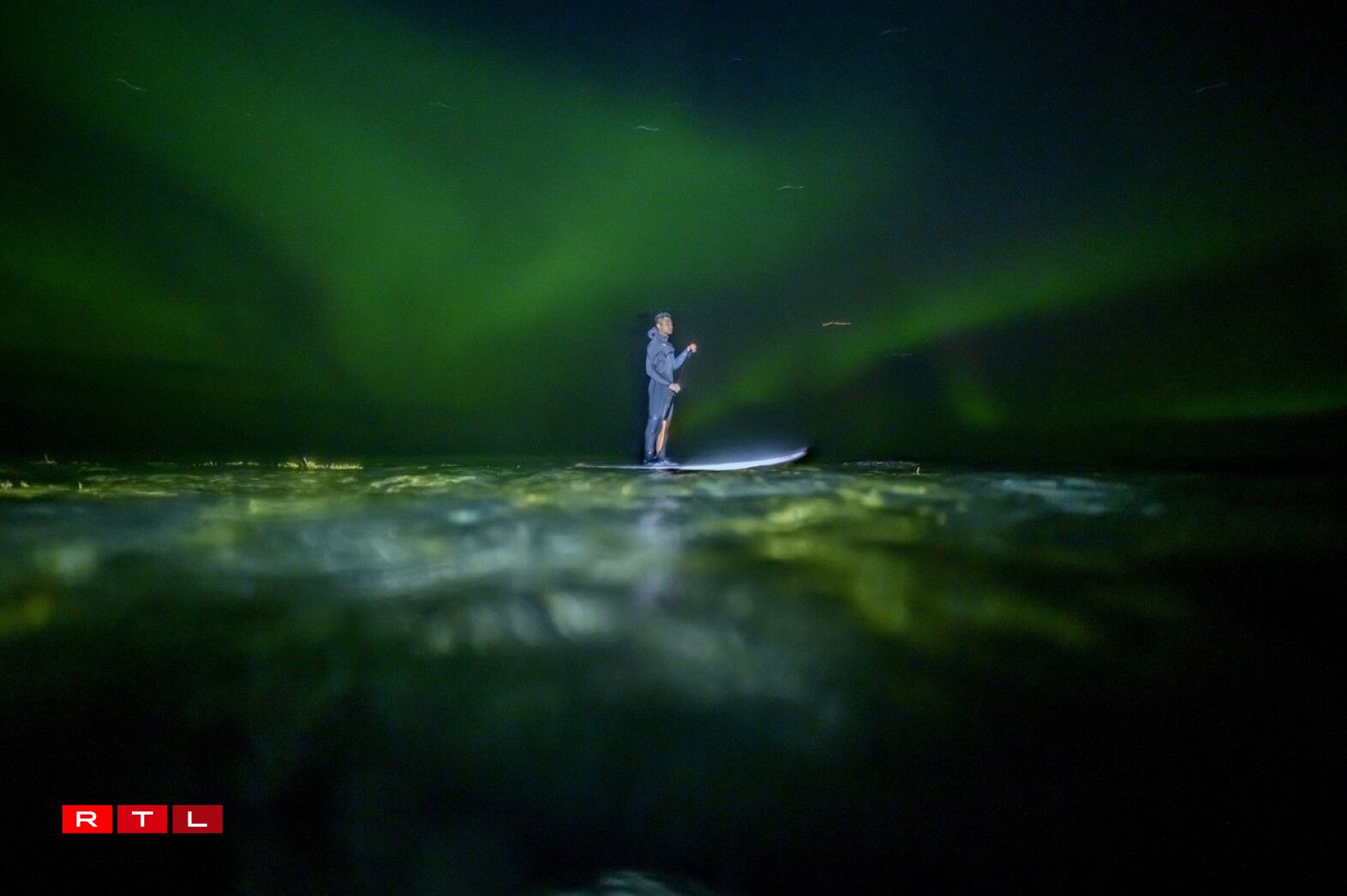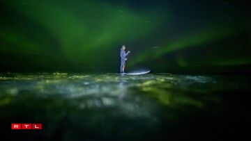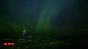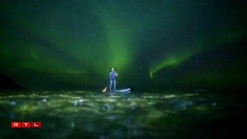 Surfeur indonésien, Edi Siswanto, revêtu de sa combinaison intégrale, évolue avec agilité sur les vagues. Equipé d’une rame, il profite de la magie des phénomènes lumineux du pôle arctique pour s’offrir une balade exceptionnelle.