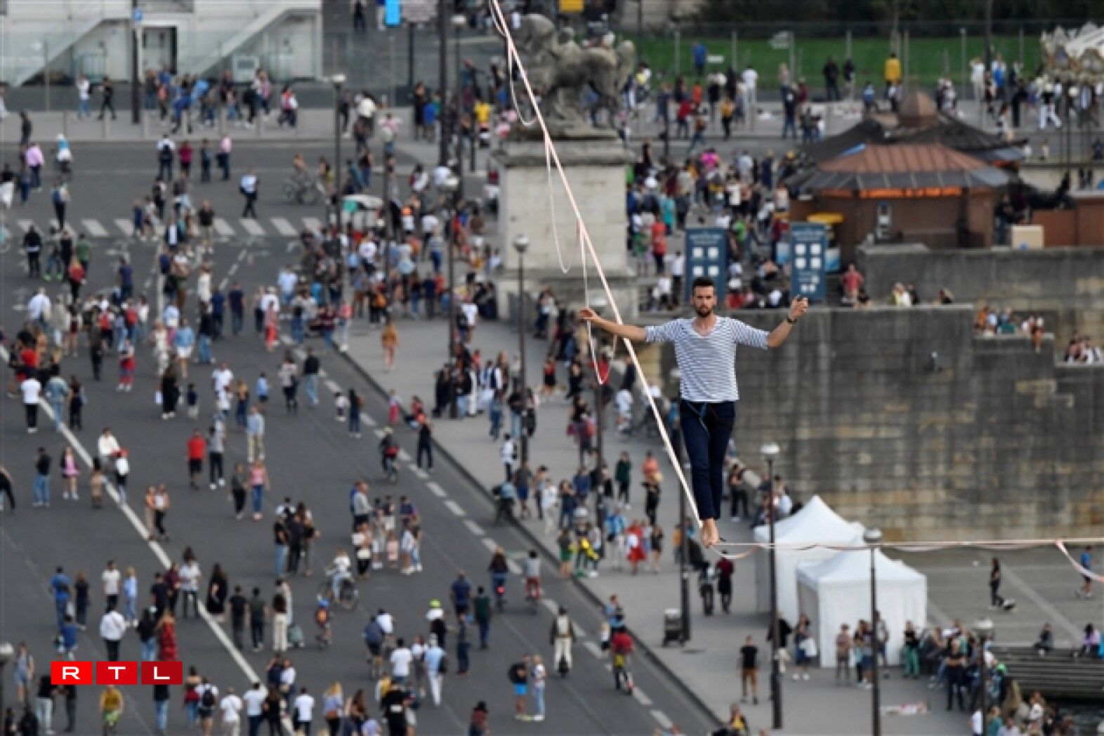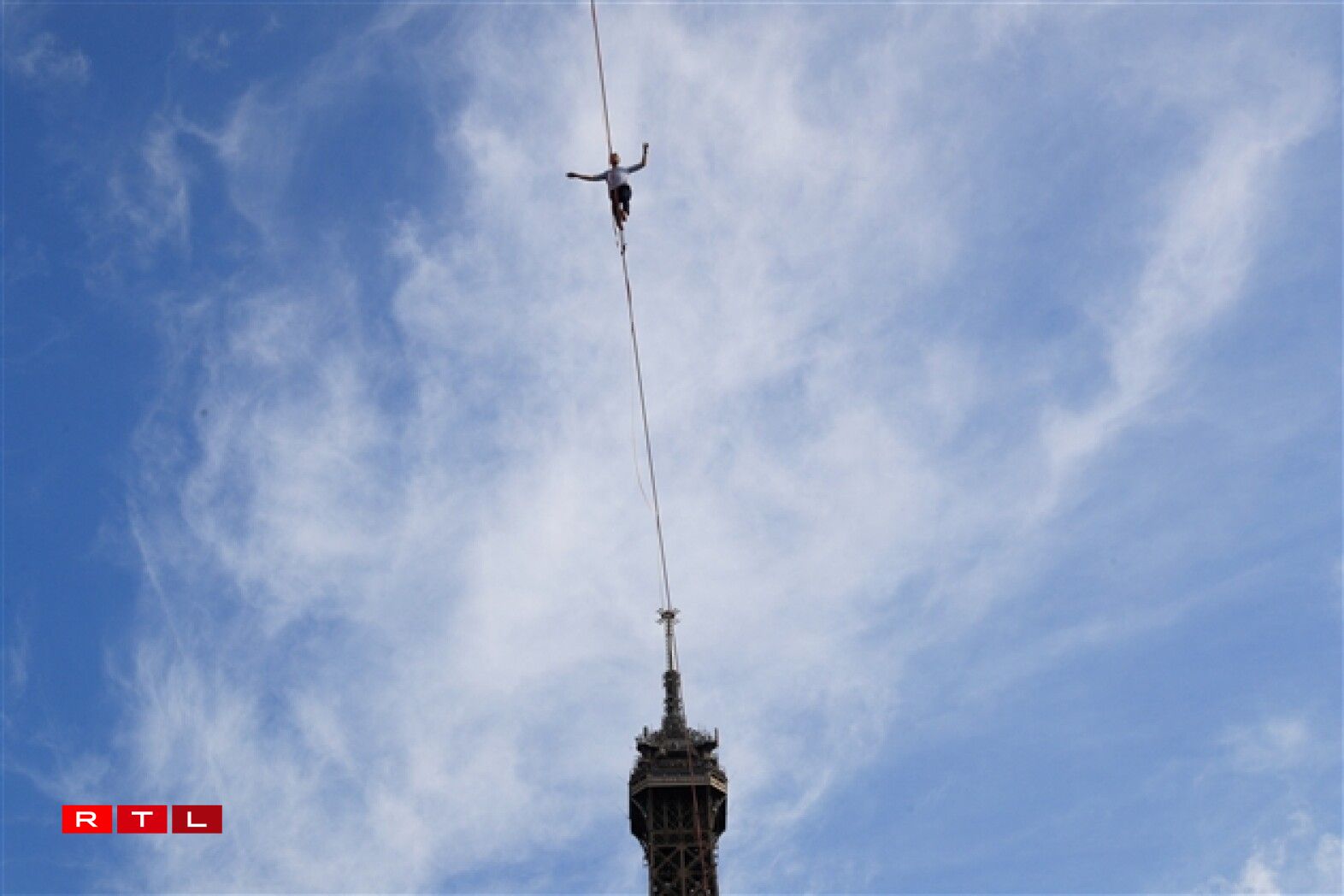 Nathan Paulin, 27 ans, “highliner” détenteur de plusieurs records du monde, s’est élancé pieds nus du premier étage de la Tour Eiffel, à l’occasion des 38e journées du Patrimoine, sous les applaudissements de la foule.