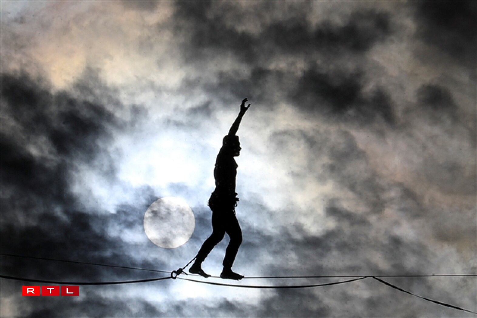 Attaché par une sangle à une longe de sécurité large de quelques centimètres, il a progressé pas à pas, hormis quelques pauses, s’asseyant ou se suspendant avant de repartir de l’avant.