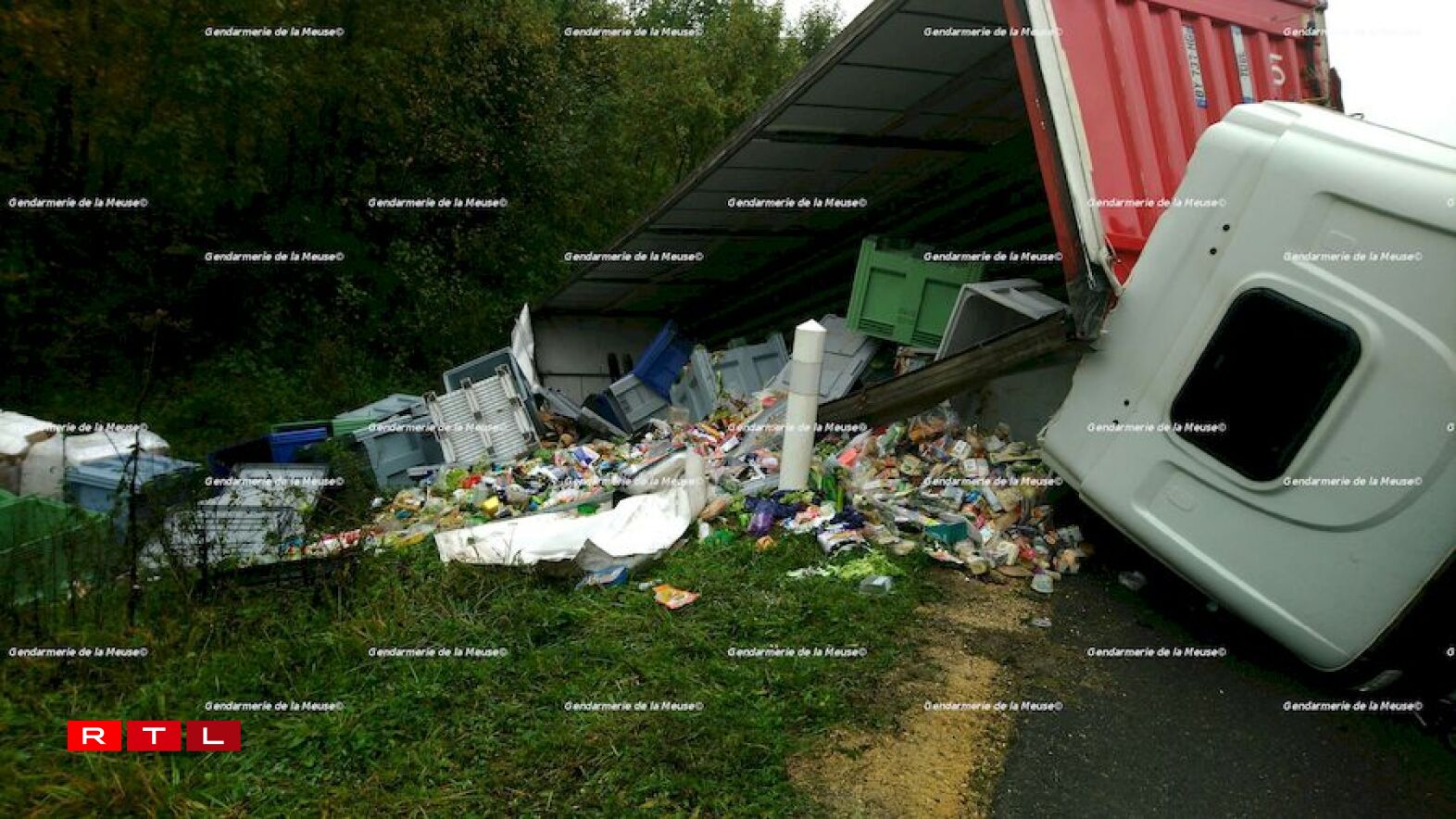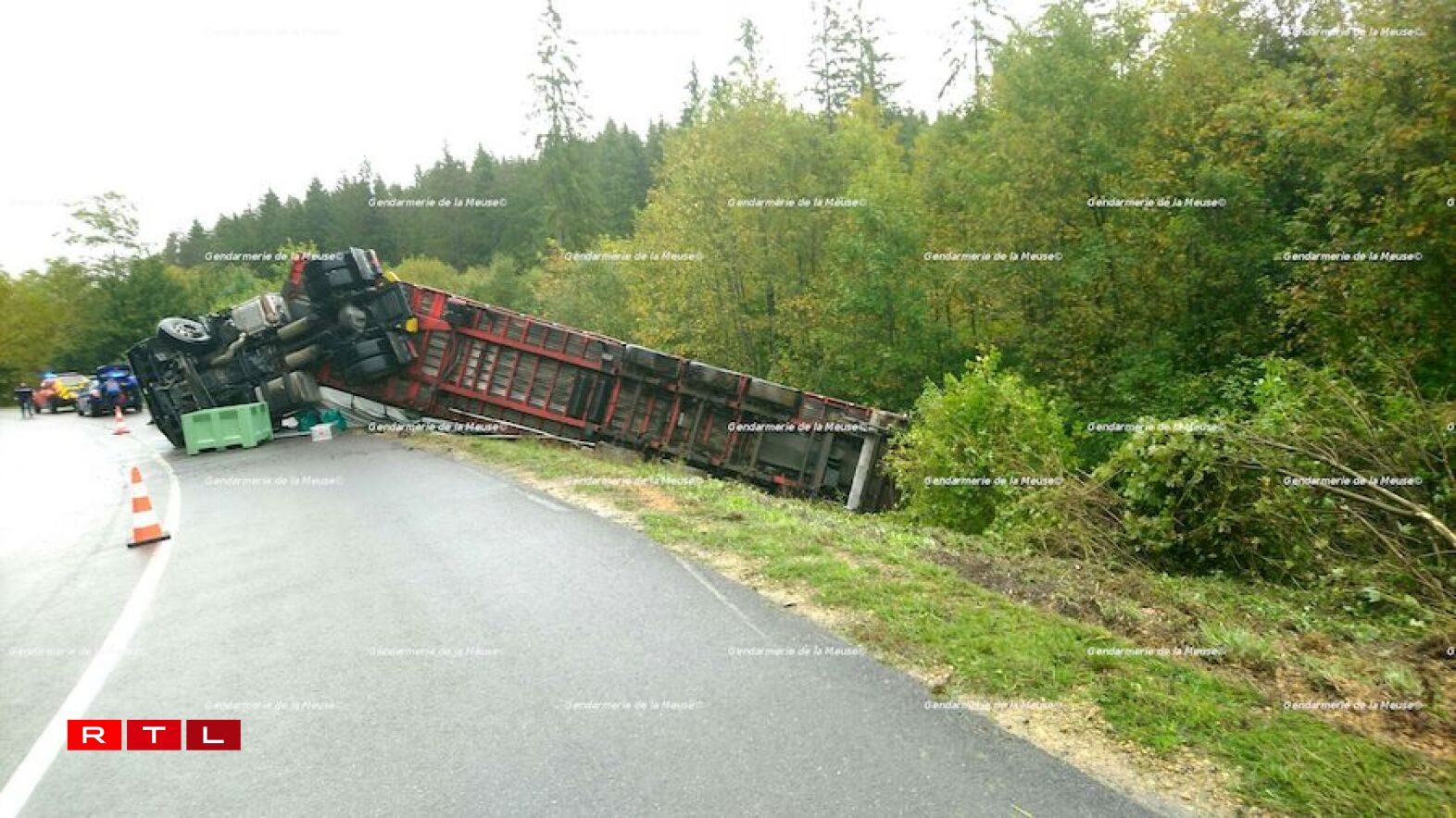 Accident spectaculaire mercredi midi dans le Bois des Caures: un poids lourd s’est couché et a déversé le contenu de sa benne sur le bas-côté de la route départementale 905.