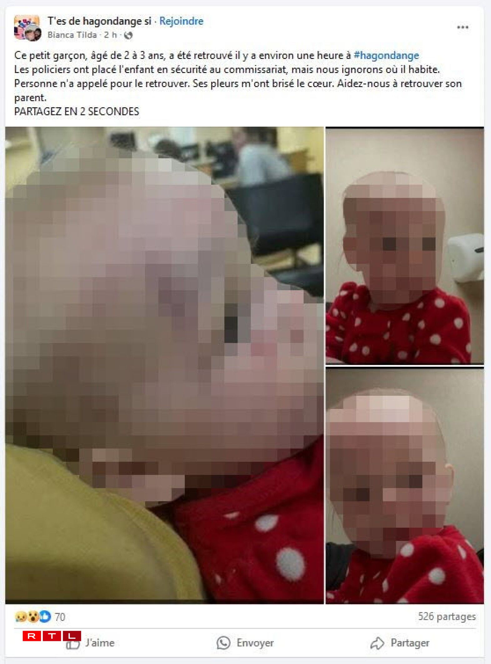 Des images montrant un bébé, le visage tuméfié, avaient circulé sur un groupe Facebook intitulé “T’es de Hagondange si” en ce mois d’avril. La publication avait évidemment suscité beaucoup d’émotions et c’était le but. Les autorités françaises ont fort heureusement très vite réagi. Elles ont démenti l’information sur leurs réseaux histoire d’éviter que le commissariat d’Hagondange soit inondé d’appels et que personne ne se fasse avoir à des sollicitations malhonnêtes.