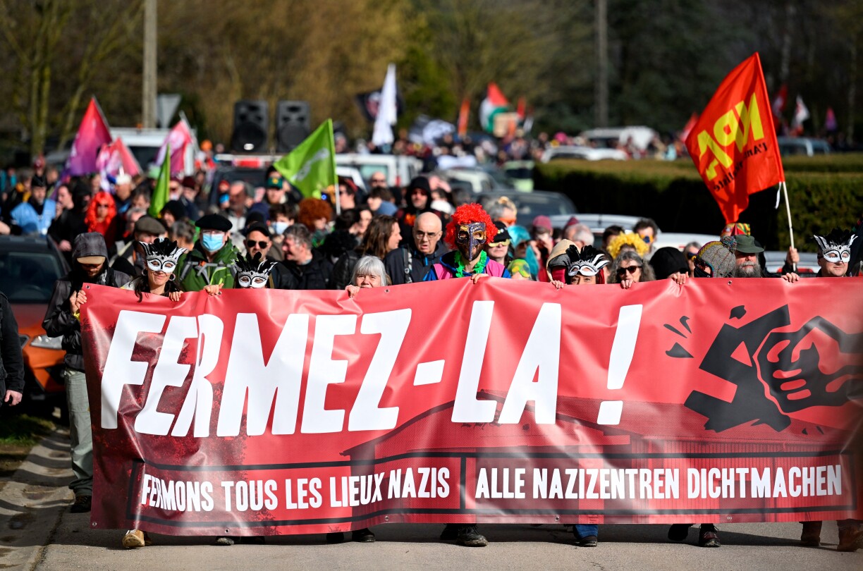Les participants ont parcouru environ 2,5 km à travers la campagne, derrière une banderole proclamant “Fermez-la! fermons tous les lieux nazis”, illustrée d’un dessin représentant un poing écrasant une croix gammée, ont constaté des journalistes de l’AFP.