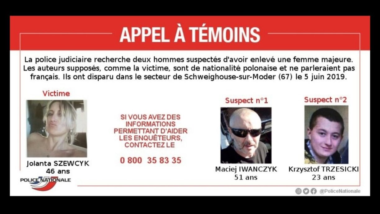 “Les auteurs supposés, comme la victime, sont de nationalité polonaise et ne parleraient pas français. Ils ont disparu dans le secteur de Schweighouse-sur-Moder (Bas-Rhin) le 5 juin 2019”, détaille l’appel à témoins diffusé par la police.