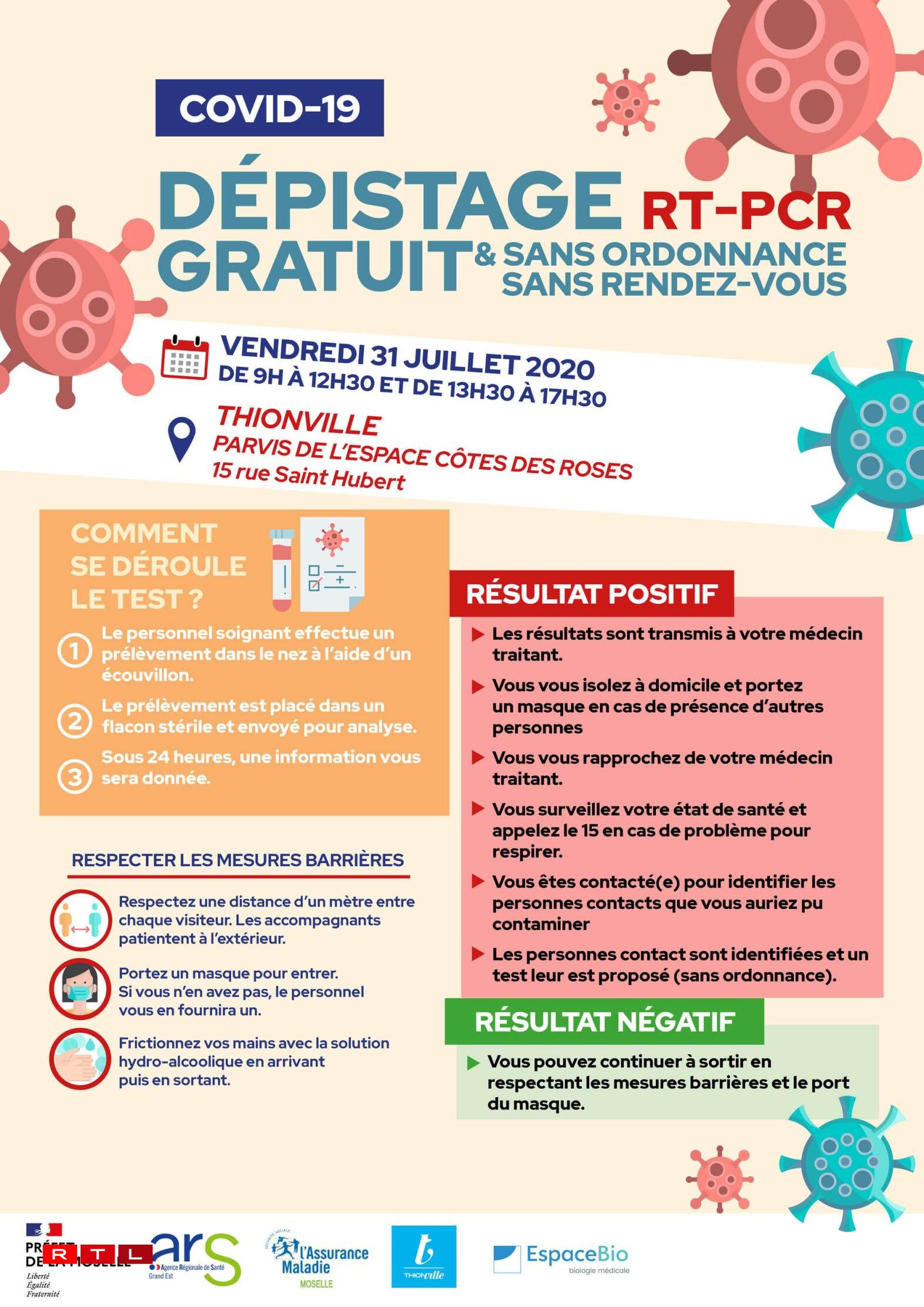 Ni ordonnance, ni rendez-vous: ce vendredi et ce samedi, la Ville de Thionville organise deux journées gratuites de dépistage du covid-19, alors que la menace du coronavirus continue de planer sur tout le territoire. Tous les habitants du secteur peuvent ainsi profiter de cette initiative, menée avec l’appui de l’Agence régionale de santé Grand Est, l’Assurance maladie, la préfecture de Moselle et d’EspaceBio.