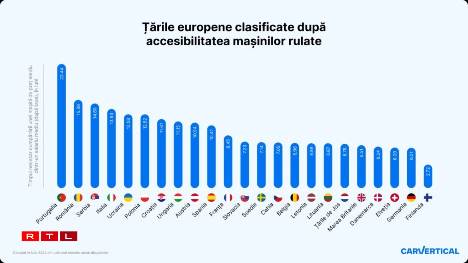 Pour mieux comprendre ce que cela représente pour les automobilistes européens, l’entreprise spécialisée dans les données automobiles carVertical s’est intéressée au nombre de mois de travail nécessaires dans 23 pays européens (sans le Luxembourg hélas) pour acquérir une voiture d’occasion.