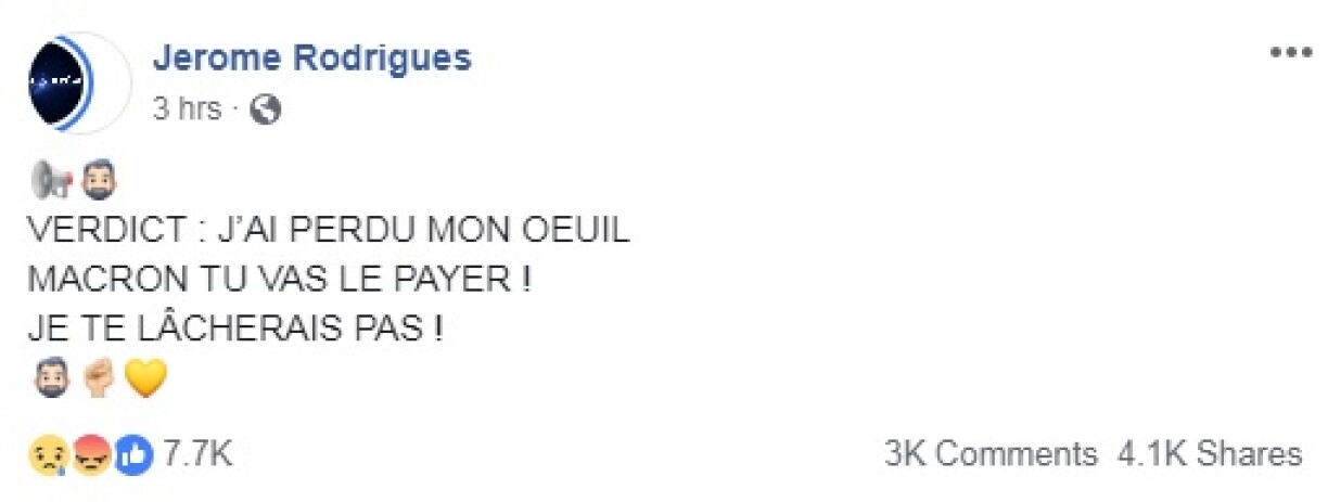 Il était l’une des figures du mouvement des gilets jaunes, le voilà maintenant devenu un symbole des violences policières. Jérôme Rodrigues, un manifestant qui s’était fait remarquer parmi les gilets jaunes, vient d’annoncer sur sa page Facebook avoir perdu la vue de l’oeil droit.