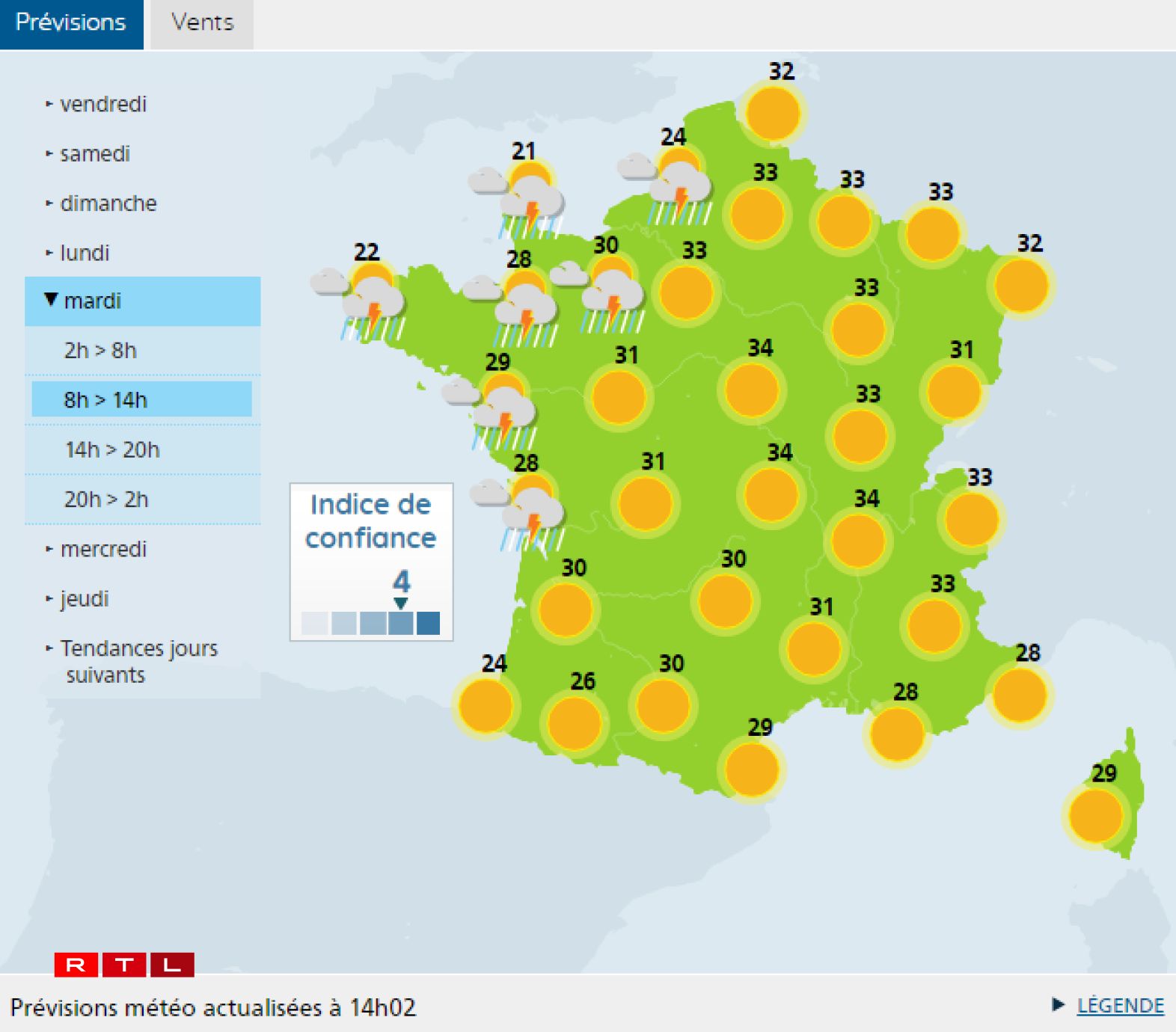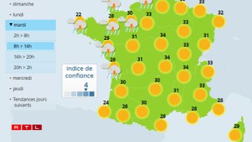 “On attend des valeurs comprises entre 35°C et 40°C sur une grande partie du pays, à l’exception de la Bretagne”, indique Météo-France dans un bulletin.
