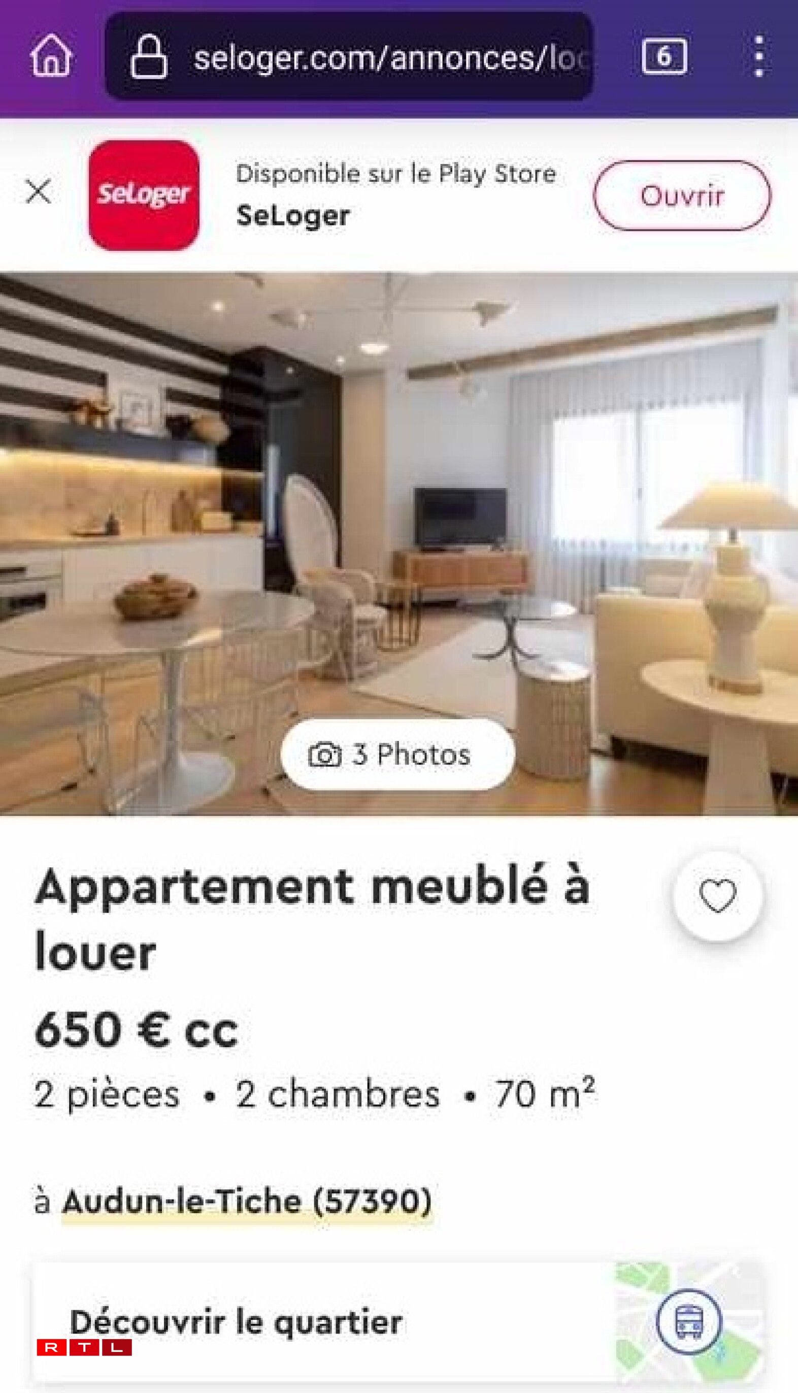 C’est le genre d’annonce où on se frotte les yeux pour être sûr d’avoir bien lu : 650 euros par mois pour un 70 m2 meublé à Audun-le-Tiche ? C’est bien en-dessous des prix du marché pour un “appartement avec deux chambres et deux salles de bains, dans un quartier très calme, à proximité des commerces...” En plus, les photos présentent un logement très cosy, décoré avec goût... Quelle affaire en or !