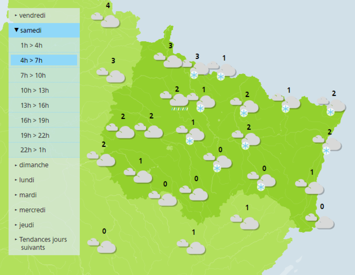 Attention: ces précipitations vont être mêlées à de la pluie entre 1h et 4h et, compte-tenu des températures prévues (entre -1 et 2°C), cela pourrait mener à l’apparition de plaques de verglas sur les routes. Météo France a placé les quatre départements lorrains ainsi que l’Alsace en vigilance jaune “neige-verglas” pour la nuit et la matinée de samedi.