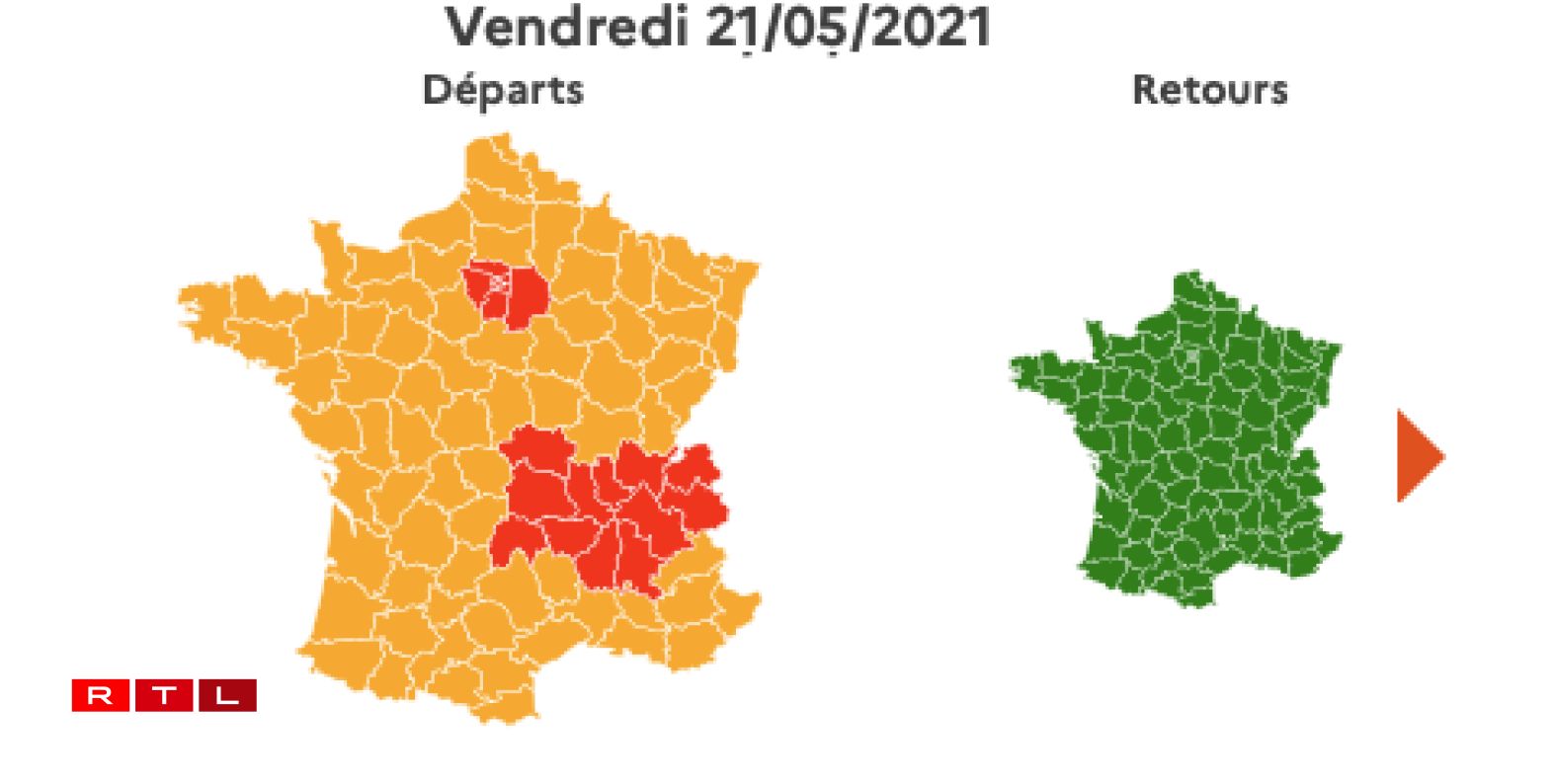 Dans le sens des départs, Bison Futé voit orange dans une très grande partie de la France ce qui signifie que la circulation sera “difficile” et ce, dès vendredi. Les zones qui virent au rouge (“très difficile”) sont l’Île de France et la zone comprise entre Lyon et Orange. La journée la plus chargée devrait être vendredi d’après le site français qui indique que “l’alerte” repassera à l’orange dans la partie sud du pays dès samedi dans le sens des départs.