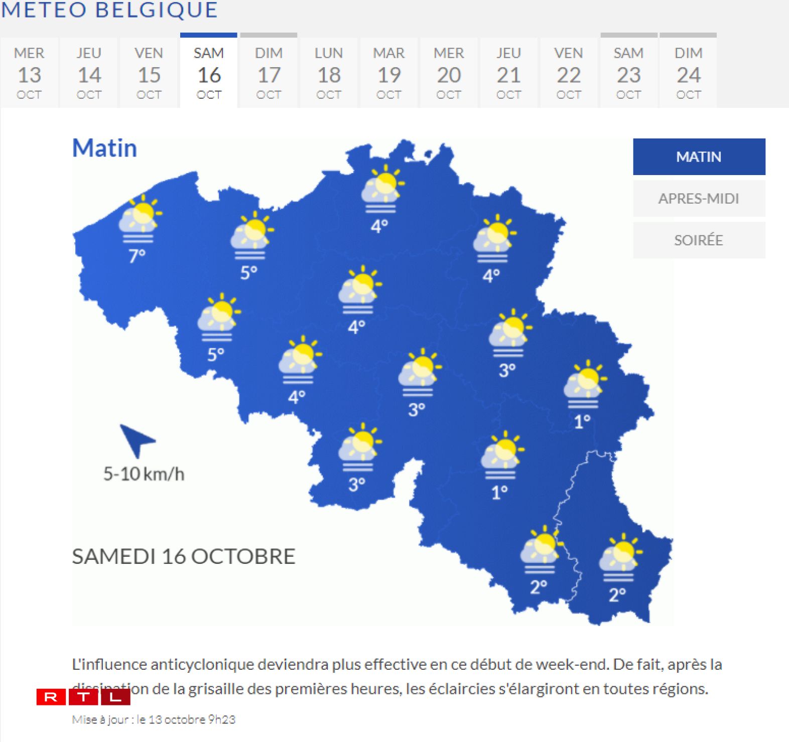 À la frontière belge, ce sera samedi matin que l’on se rapprochera le plus des températures négatives. D’après Météo Belgique, le thermomètre affichera 2°C à Bastogne et à Malmédy.