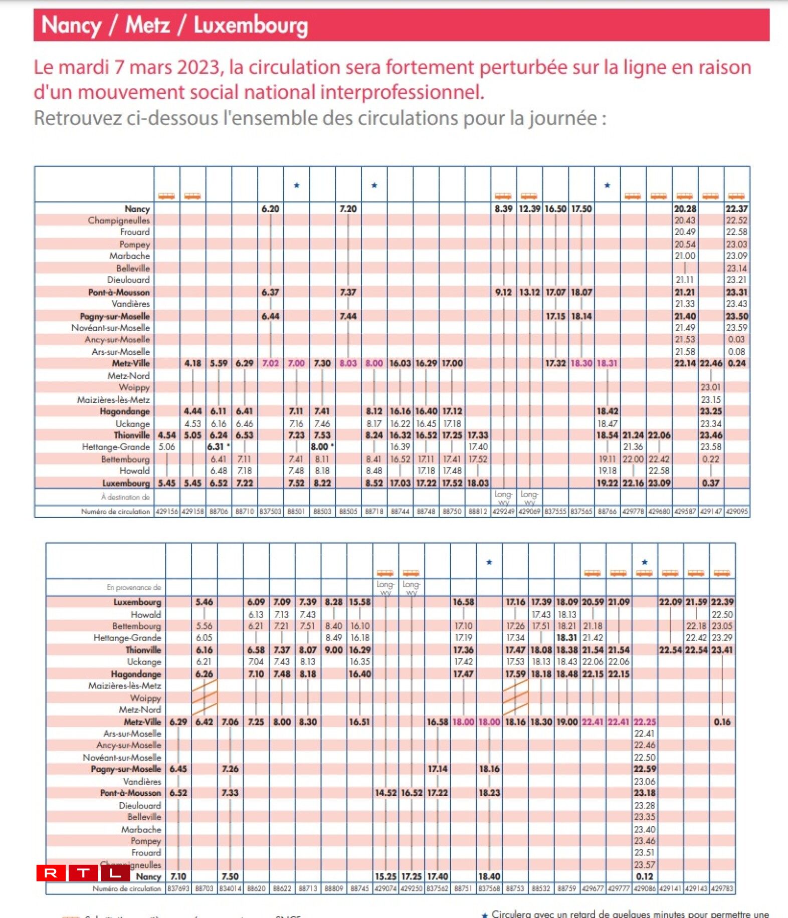 La SNCF a publié toutes les perturbations dans le Grand Est, et comme on pouvait s’y attendre, prendre le train entre la Lorraine et le Luxembourg sera compliqué, avec de nombreux trains supprimés du côté de l’axe Metz-Thionville-Luxembourg, qui sera d’ailleurs la seule ligne à circuler en Lorraine avec celle de Longwy-Luxembourg (des cars de substitutions seront proposés pour les autres)