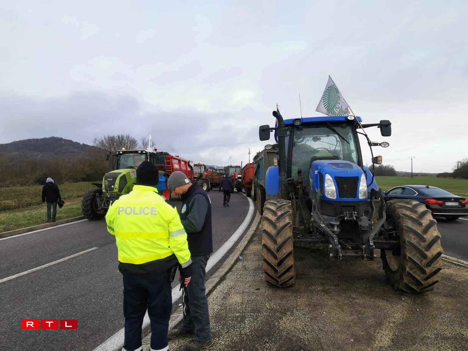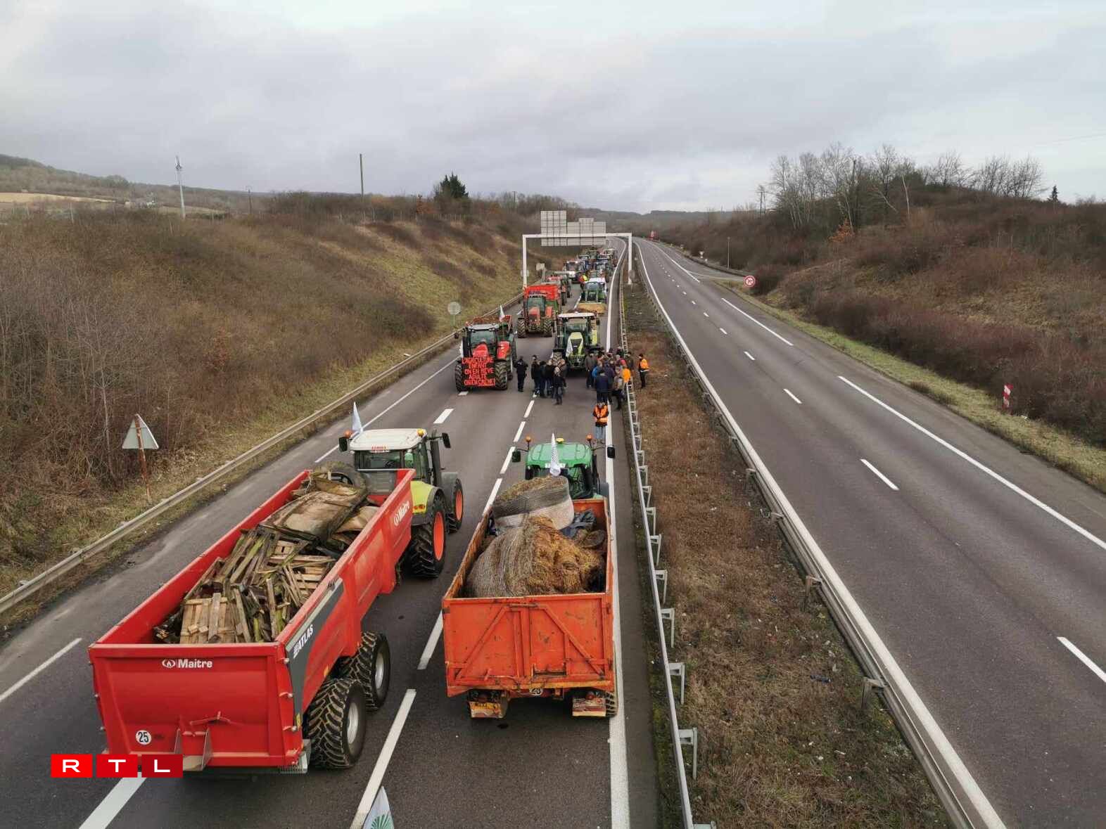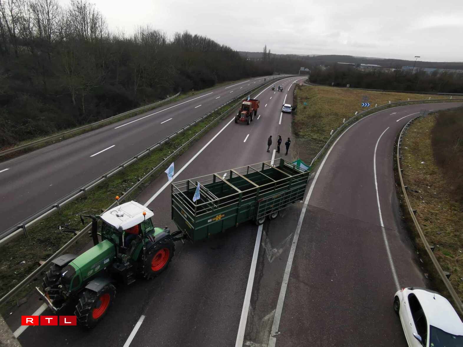 Dès 9h jeudi, la DIR Est a bloqué la bretelle d’entrée 43 à hauteur de Veymerange et la police a redirigé la première vague de véhicules, camions compris, vers la D14 en direction de Longwy. À ce moment-là, les agents de police eux-mêmes ne savaient pas encore où les tracteurs allaient précisément investir l’A31 ni s’ils allaient se déplacer ensuite. Ils ont eu la réponse à 10h20, moment où les premiers engins ont dévalé la D14 dans le sens inverse pour prendre à contresens la sortie 43 menant à Longwy et à Thionville Ouest et se stationner définitivement sur les voies de l’A31, dans le sens Luxembourg - Thionville. À 11h, d’autres tracteurs sont arrivés de Metz, dans le sens opposé, dans un concert de klaxon, les bennes remplies de pneus, de palettes et de fumier. A priori, la cinquantaine d’engins ne bougeront plus de là jusqu’à vendredi 16h.