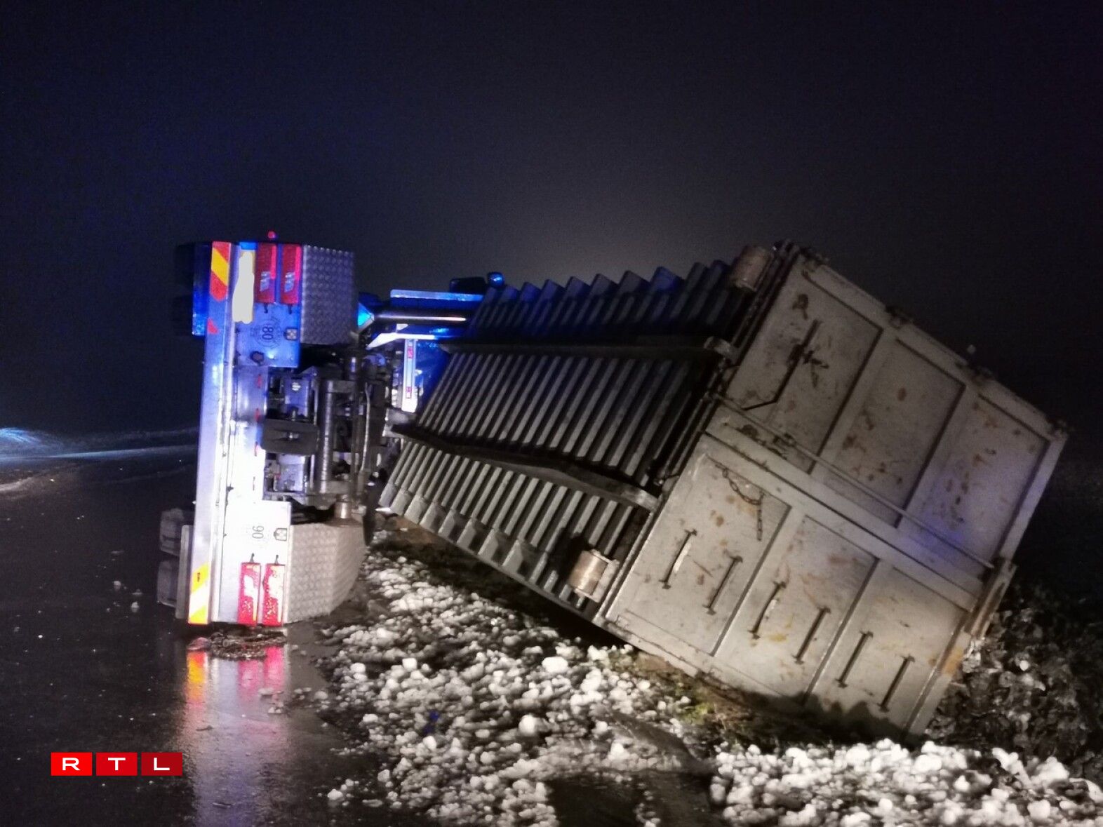Pour une raison qui n’a pas encore été déterminée, sans doute la chaussée était-elle glissante un conducteur de camion a perdu le contrôle de son véhicule à la sortie du rond-point entre la D952 la D16. Il s’est couché sur le flanc et perdu son chargement.