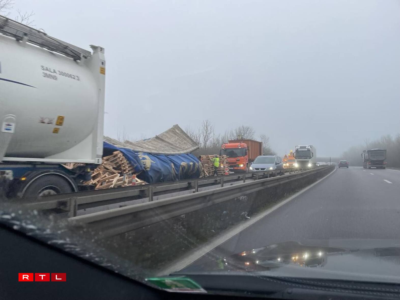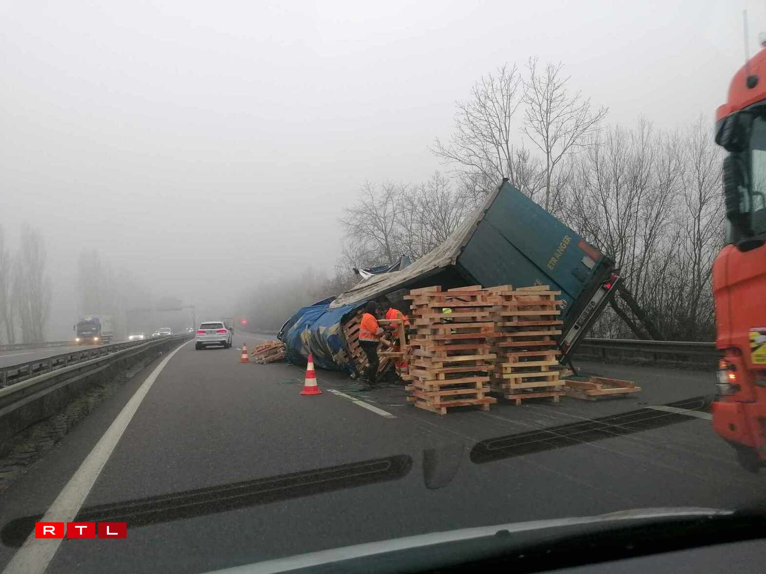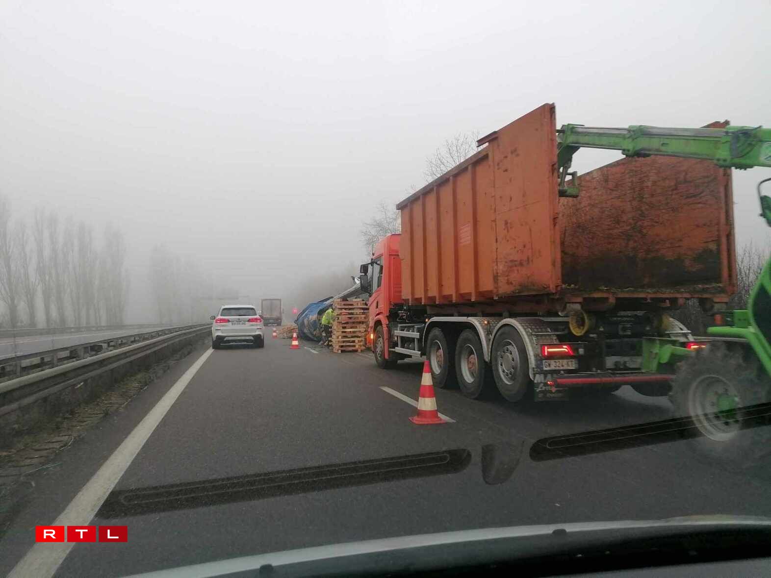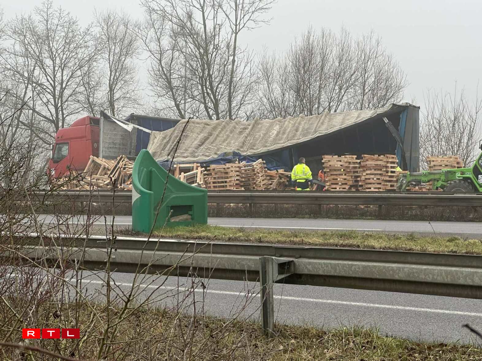 Pour l’heure, la voie de droite est condamnée. Le temps de ramasser les palettes et ensuite d’évacuer la remorque du 38 tonnes, complètement disloquée au niveau de sa structure.