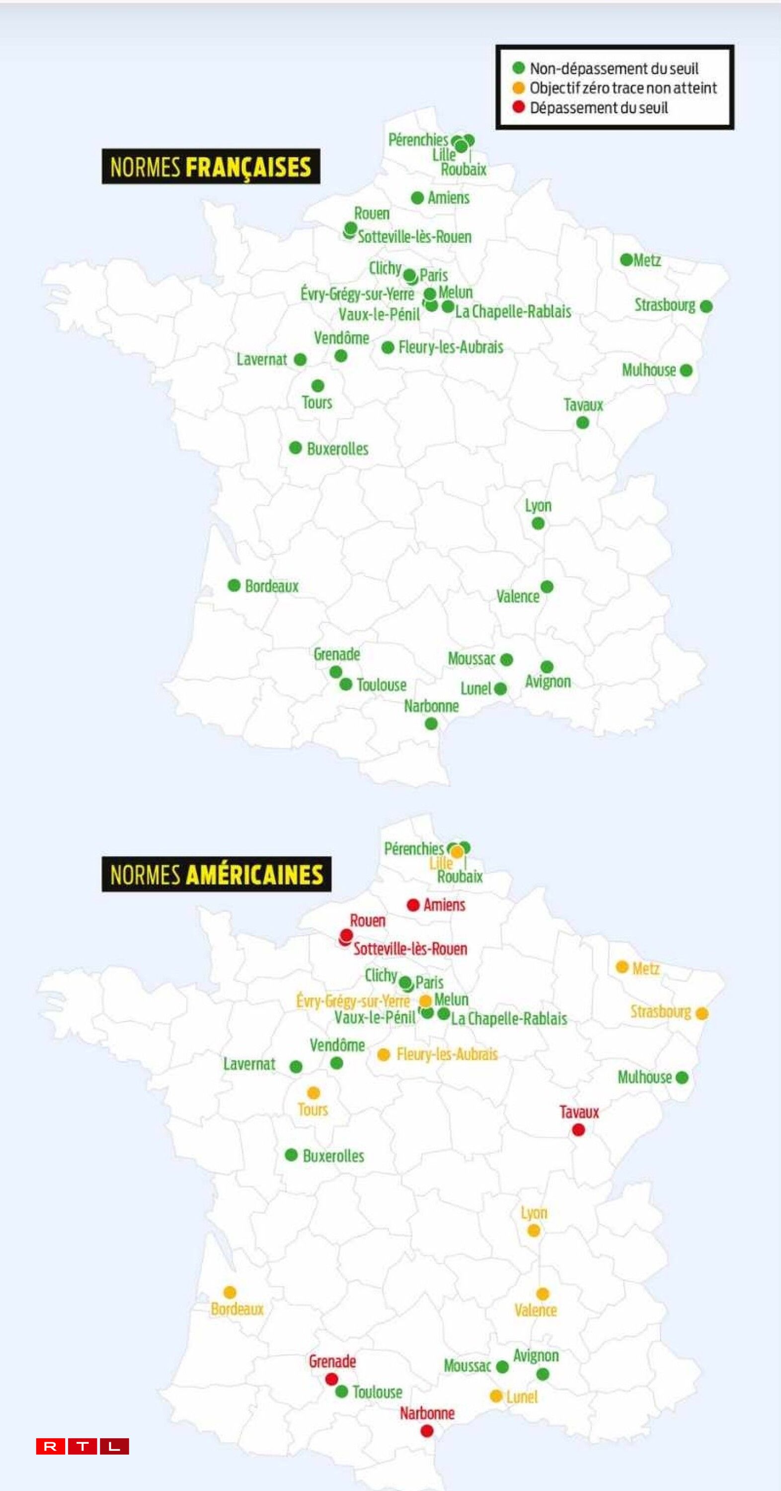 Metz est notamment cité dans cette étude. Que Choisir rappelle que la France se contente d’appliquer les seuils réglementaires fixés par l’UE. Seuils qui seraient laxistes, si on compare avec ceux, plus protecteurs, que vont appliquer les États-Unis. Ainsi, si Metz est affichée en vert (non dépassement du seuil) selon les critères français, elle passe en orange (objectif zéro trace non atteint) selon les critères américains qui sont plus contraignants.
