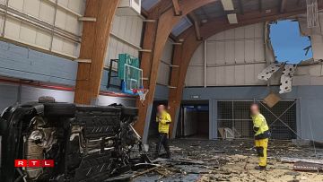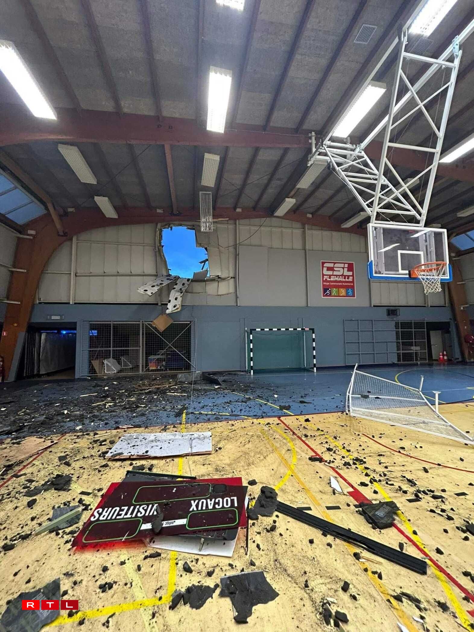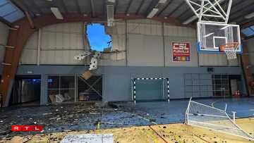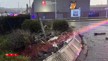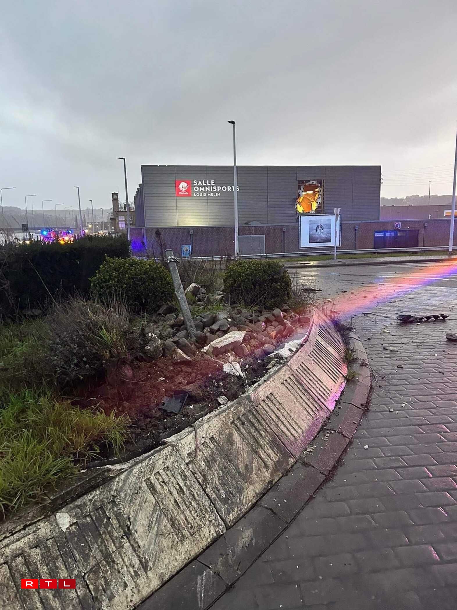 La voiture circulait tellement vite qu’elle s’est élevée dans les airs puis a traversé le mur de la Salle Omnisports Louis Melin. Au volant, Sofiane Kiyine, joueur d’Oud-Heverlee Louvain en première division belge.