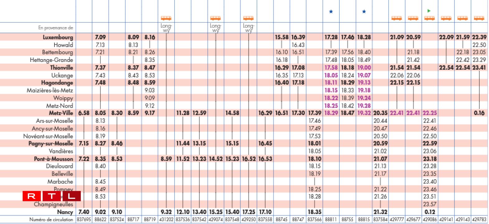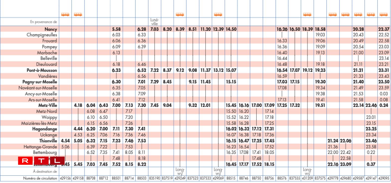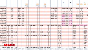 Le matin, seuls cinq trains circuleront entre Metz et Luxembourg. Le premier partira à 6h04 et le dernier à 7h30. Sur le chemin des retours, cinq liaisons sont prévues. La première pour 15h58 et la dernière pour 18h28. Des navettes feront également le trajet après 21h.