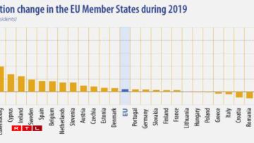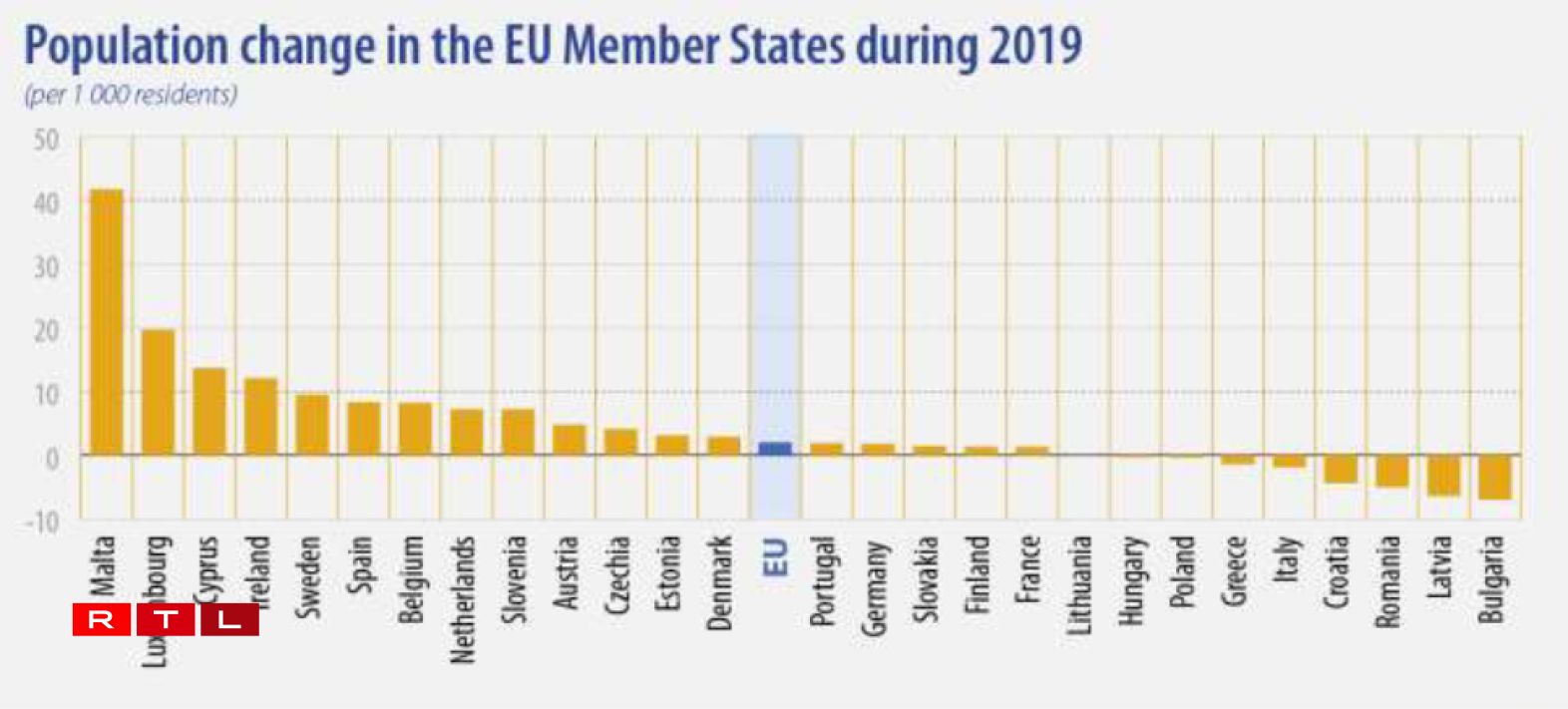 Le Luxembourg fait partie des rares pays dont la population augmente continuellement mais reste loin derrière Malte en terme de croissance entre 2019 et 2020. En effet, l’île a enregistré une augmentation de sa population de 41,7‰ contre les 19,7‰ luxembourgeois. Ces dans les pays comme la Bulgarie (- 7‰), la Lettonie (- 6,5‰), la Roumanie (-5‰) , la Croatie (- 4,4‰) ou encore l’Italie (- 1,19‰) où la population a le plus baissé.