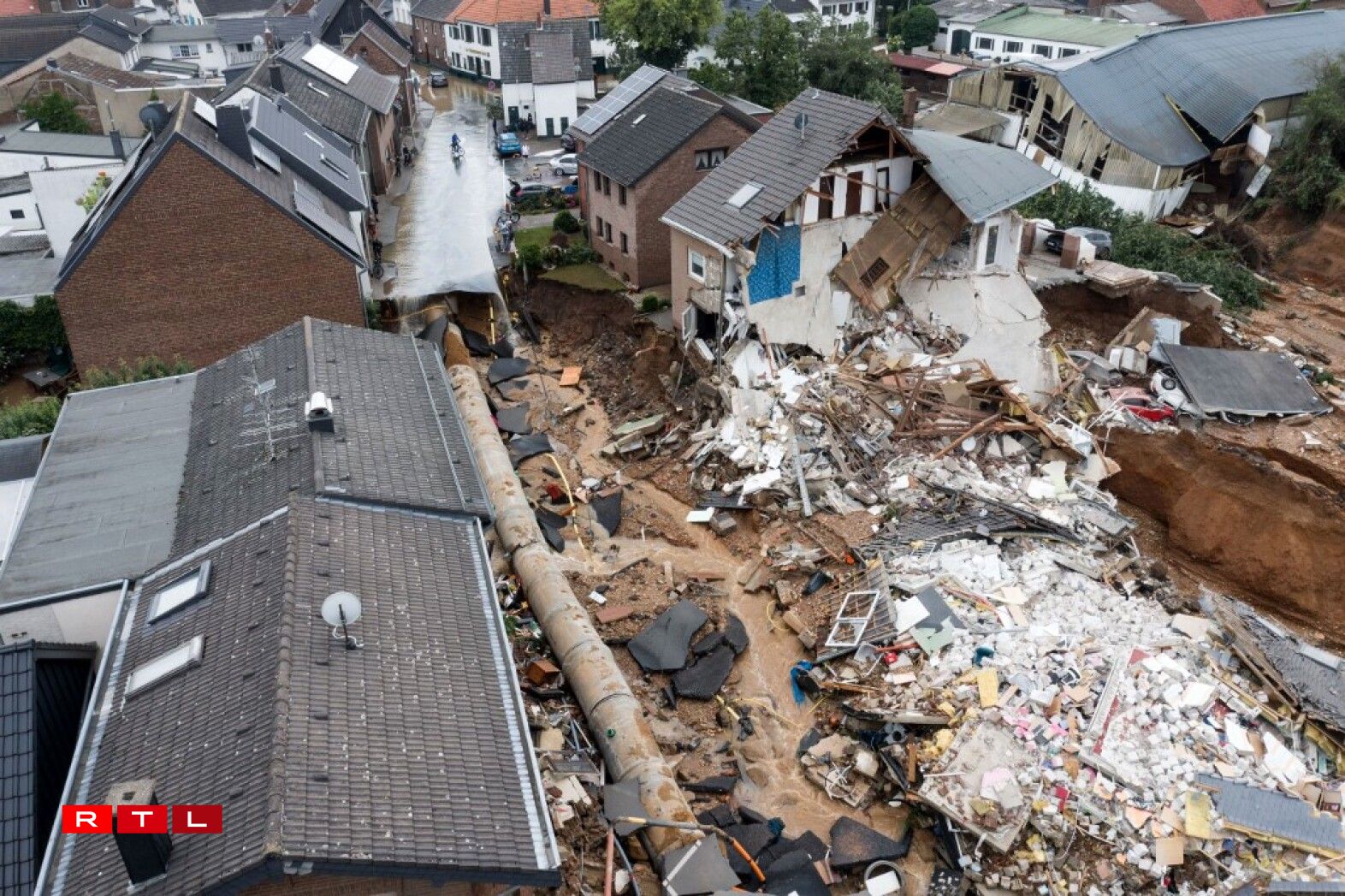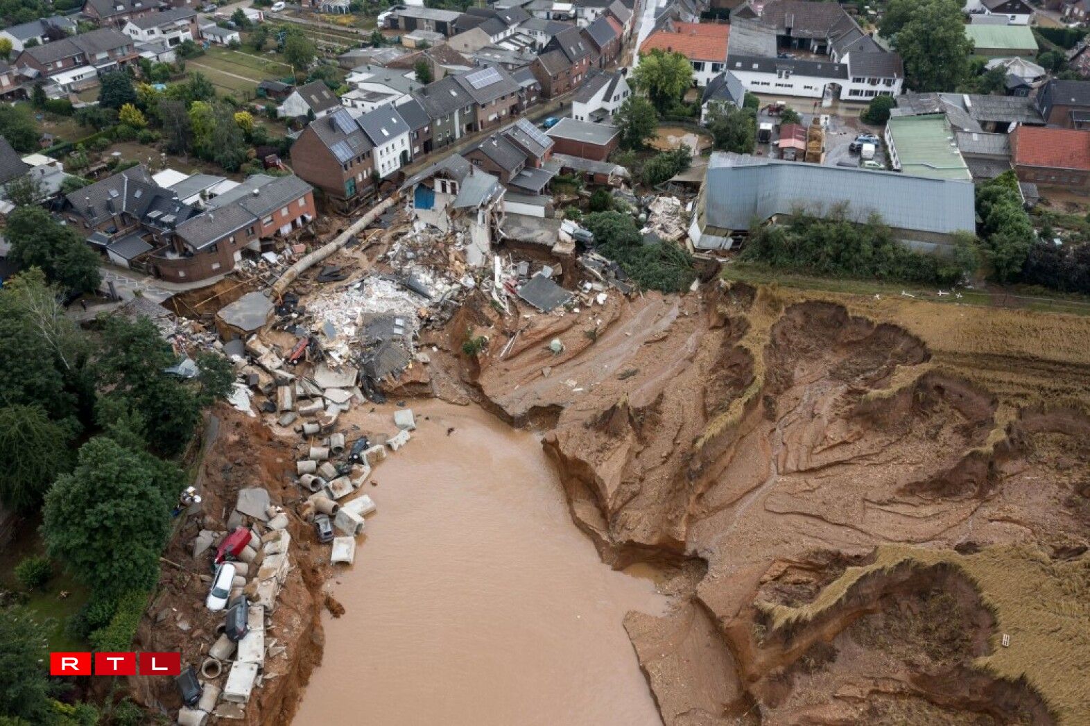 Près de Cologne à Erfstadt, une portion de village s’est littéralement effondrée sur elle-même suite à un glissement de terrain vendredi. Les images, spectaculaires, de la zone sinistrée montraient un vaste cratère béant dans lequel se déversaient des masses de terre, d’eau brune et de débris.
