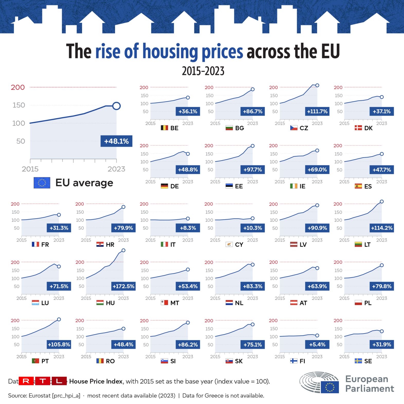 Et c’est partout pareil : entre 2015 et 2023, les prix de l’immobilier ont augmenté de près de 50 % dans l’ensemble de l’Union européenne. Mais certains pays s’en sortent mieux. En Finlande, par exemple, les prix des logements ont connu la plus faible augmentation (5,4 %), ce qui facilite grandement l’autonomisation des jeunes. Au Luxembourg, sans surprise, la hausse des prix est bien plus décourageante (+71,5%).