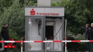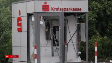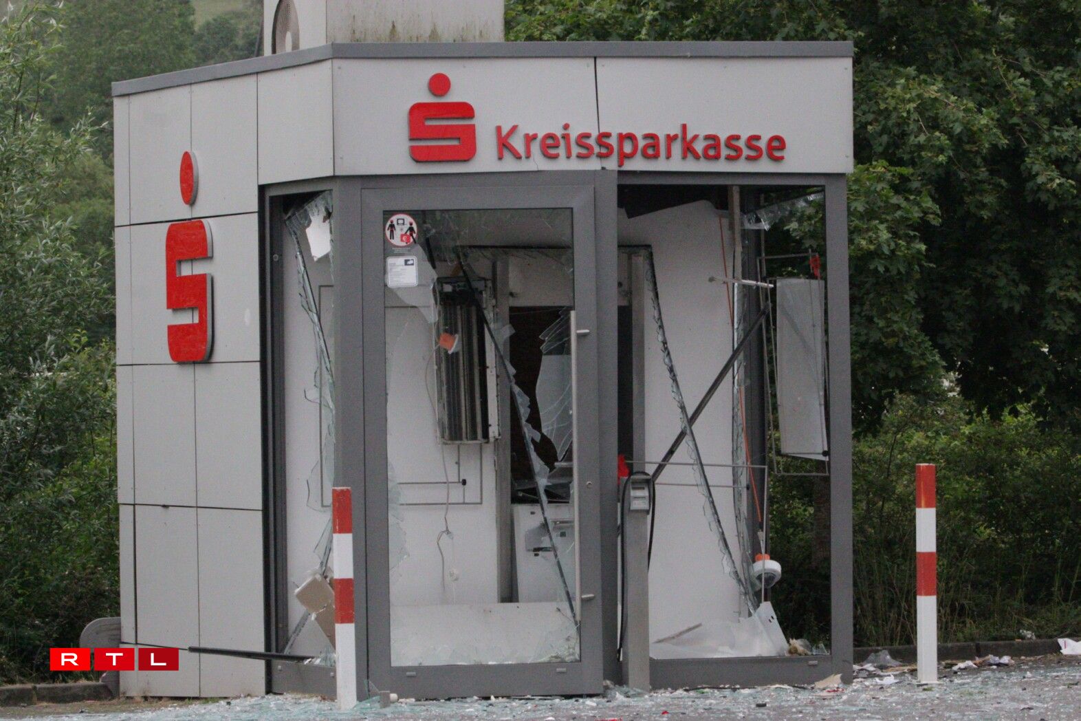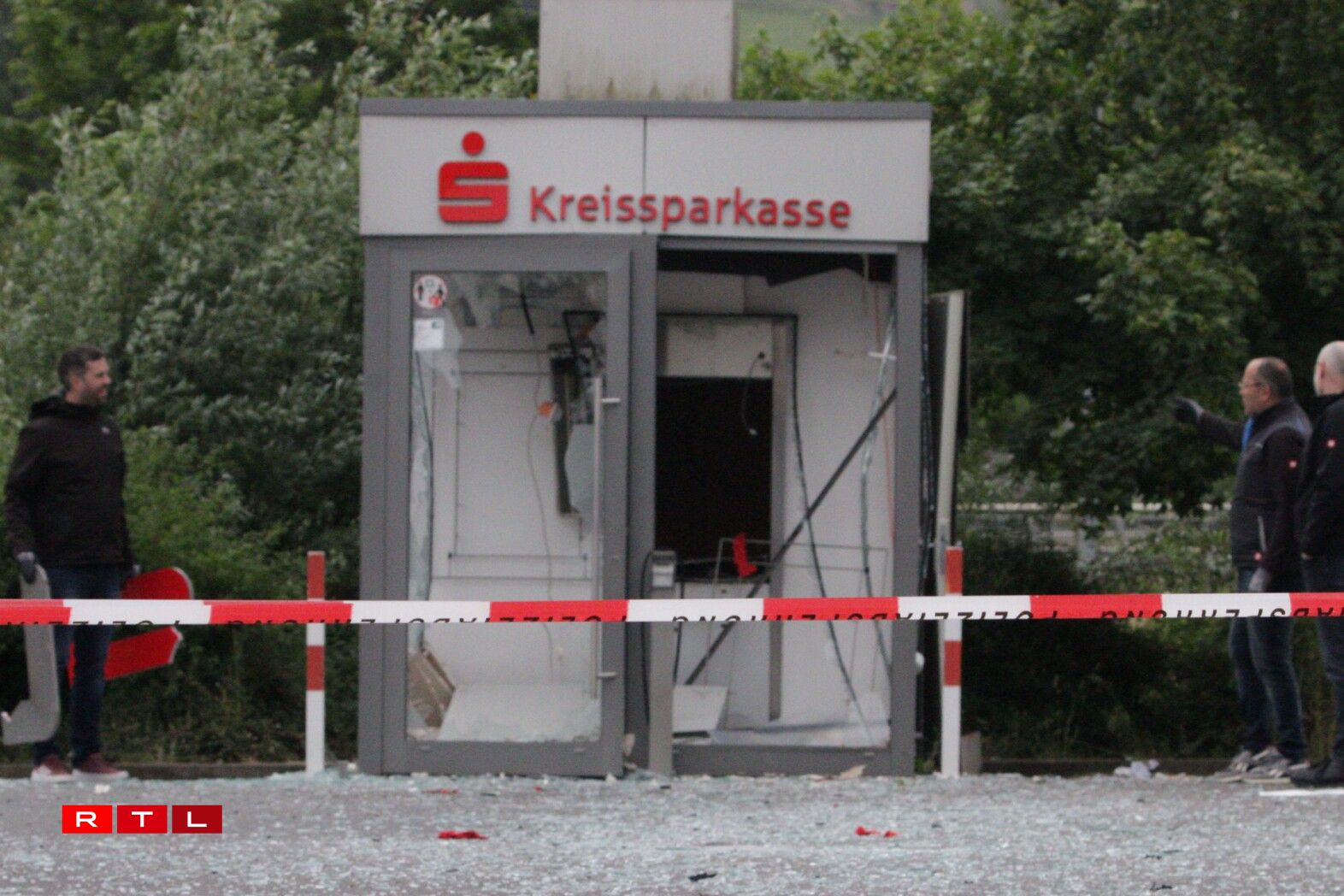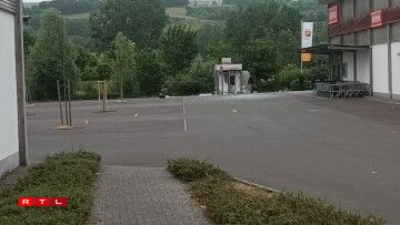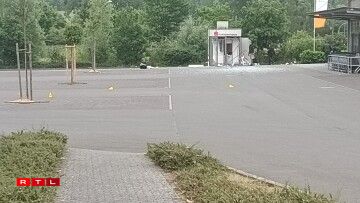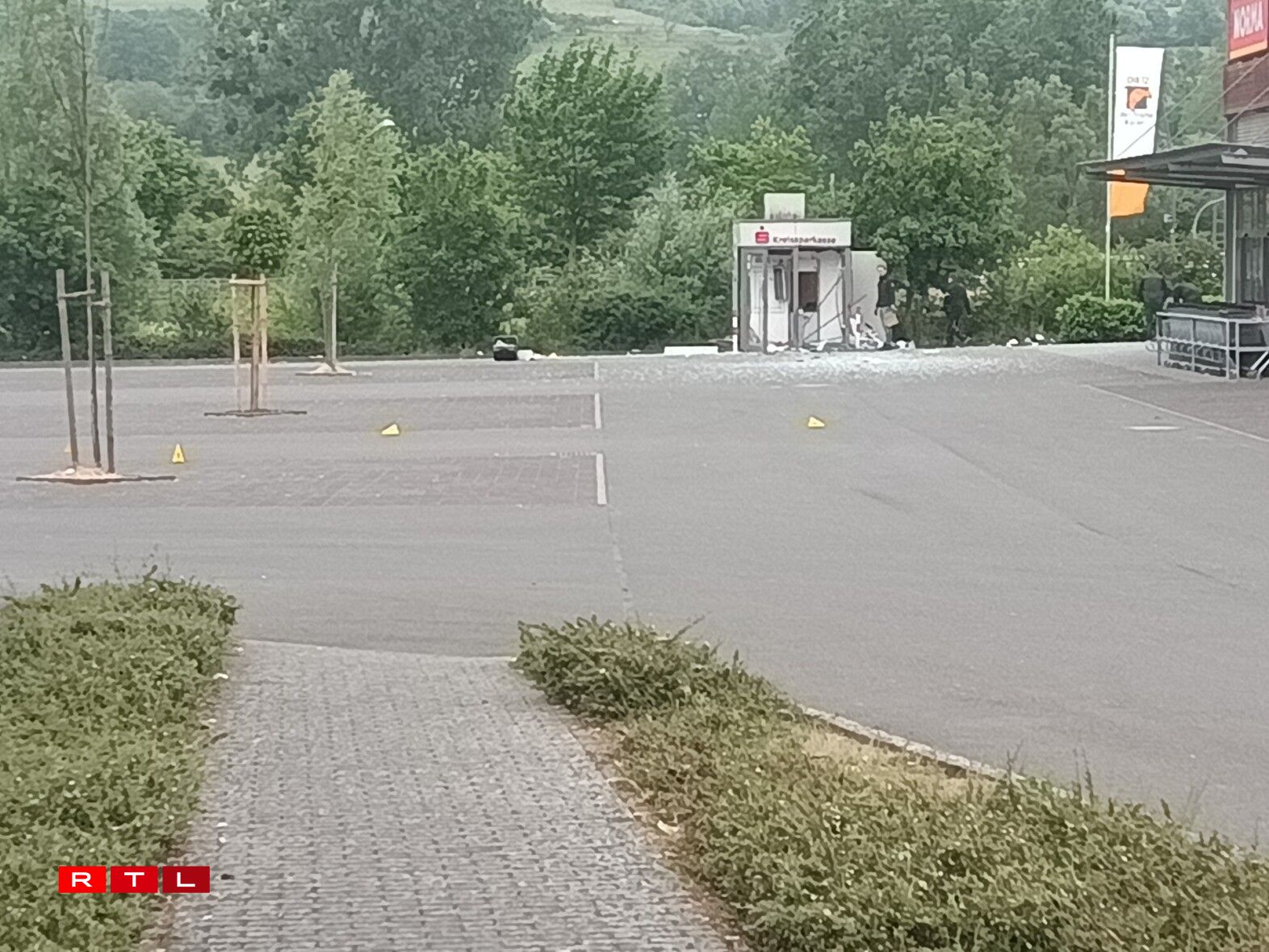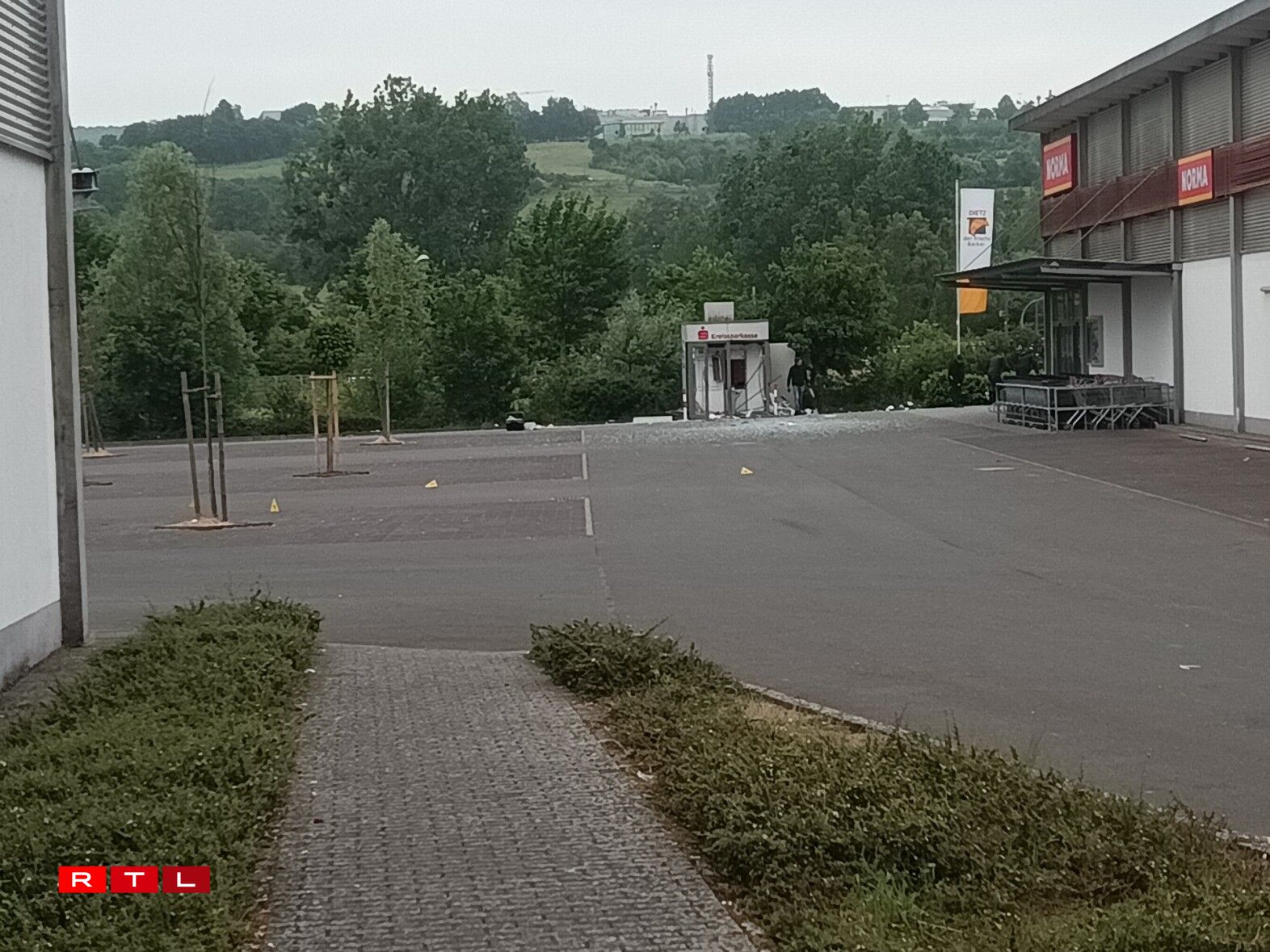 Le distributeur de la Kreissparkasse qui a volé en éclat est esseulé sur le parking du supermarché Norma situé rue de Bitburg à Echternacherbrück.